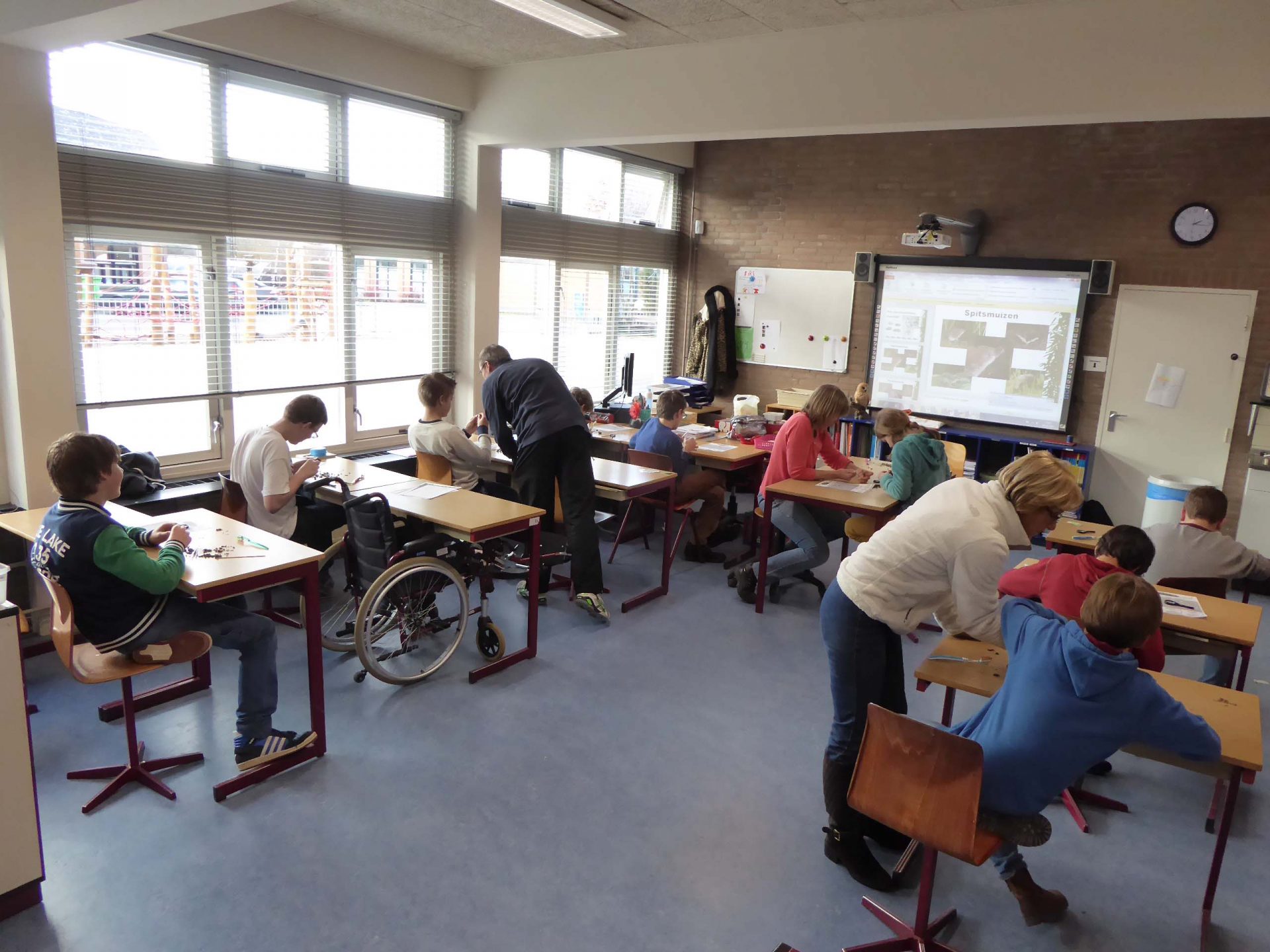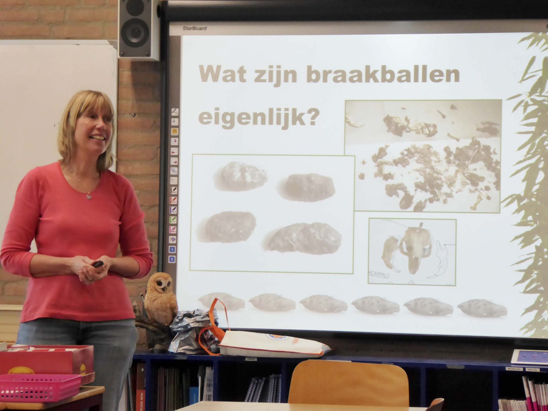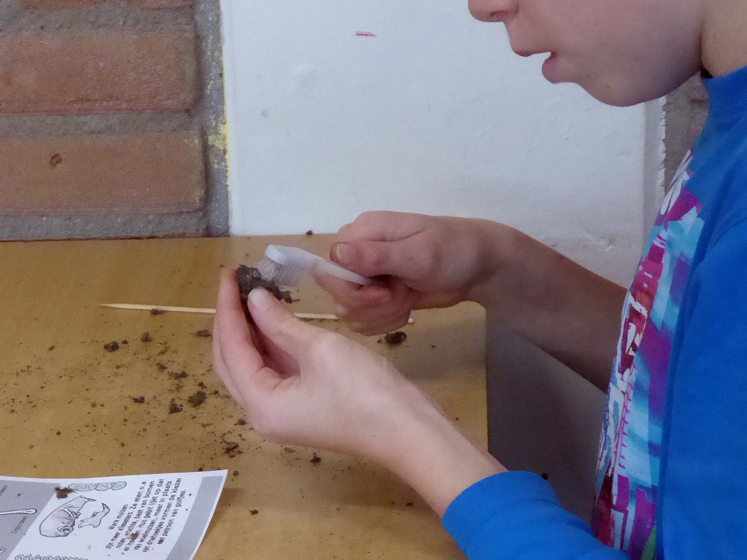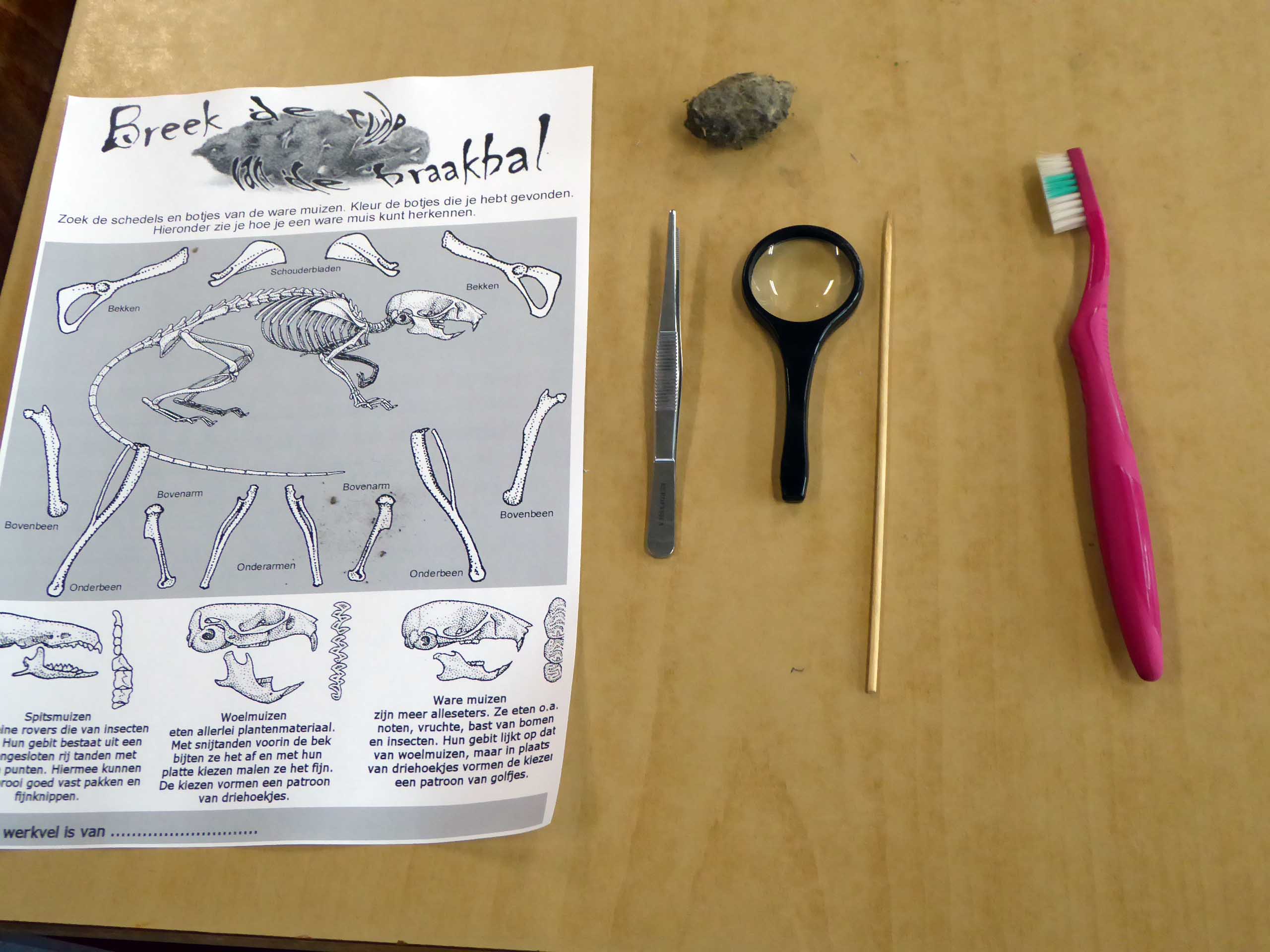 Nettie van der Meij leidde de les en begon met een inleiding over uilen en hun favoriete voedsel: muizen. Het bleek snel dat verschillende kinderen al veel van dat onderwerp af wisten. Ze konden zelfs best moeilijke vragen beantwoorden, zoals de manier waarop uilen hun prooi vangen. Na een kwartiertje werden de gereedschappen, de zoekkaart waarop alle muizenbotjes zijn getekend en de braakballen uitgedeeld en gingen de leerlingen aan het werk.
