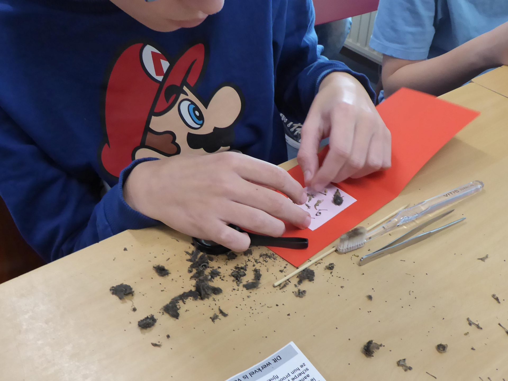 Na een half uurtje pluizen kregen alle leerlingen een plakkaart zodat ze hun vondsten konden opplakken om mee naar huis te nemen. Na anderhalf uur werden de spullen opgeruimd de tafels schoongemaakt, de handen gewassen en was deze spannende les weer afgelopen.