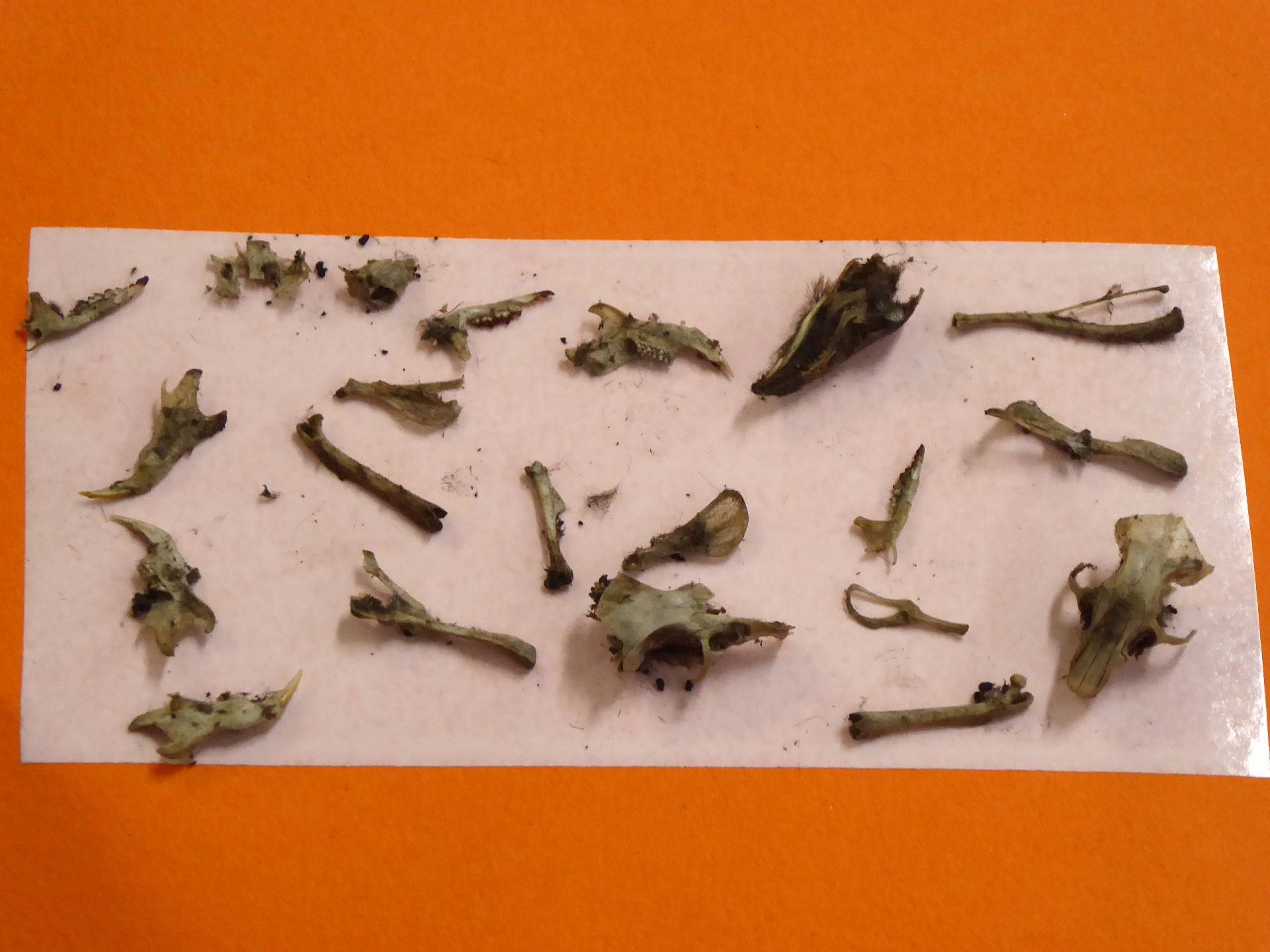 Sommigen hadden al vaker uilenballen uitgepluist maar iedereen was nog steeds enthousiast. In iedere braakbal zaten wel botjes, kaakjes en schedeltjes van muizen. In sommige wel van drie of vier prooien. De meeste muizen die we vonden waren spitsmuizen, te herkennen aan de vorm van het gebit en de rode puntjes op de tanden. De tweede soort was de woelmuis. En waarschijnlijk waren de dikkere botten in een van de braakballen van een kleine rat.